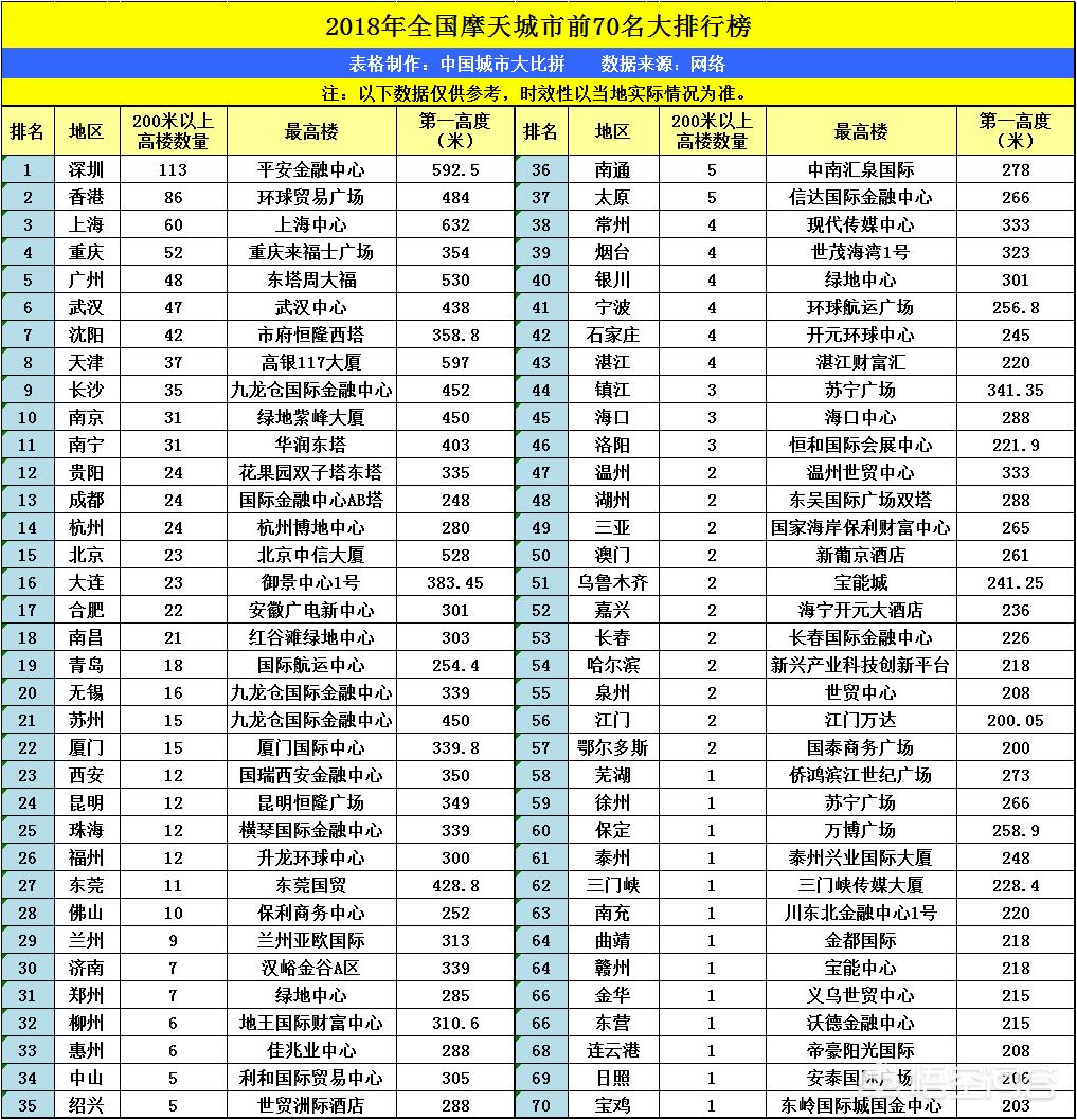 再来看人均可支配收入情况。合肥市为35175元,而南昌市尚未进入前五十名。接下来我们再来看城建水平。看200米以上的摩天数量比较,合肥市为22座 最高的是301米的安徽广电新中心,而南昌市有21座,最高的是303米的红谷滩绿地中心。大家对于这两个城市,更喜欢哪一个呢?